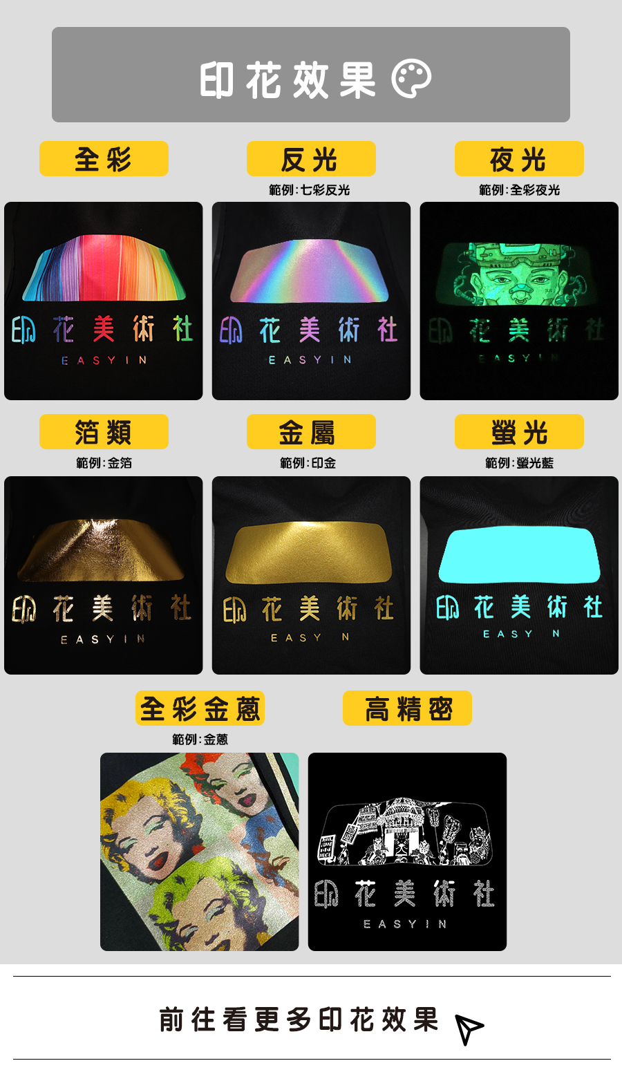 | 一.以上價格可使用的印花效果:全彩.亮彩箔.金屬色..螢光色 二.同件商品加印8X8cm以內圖案(*加印小圖) (單位:台幣/NT未稅價) ※運費另計。 | |||||||