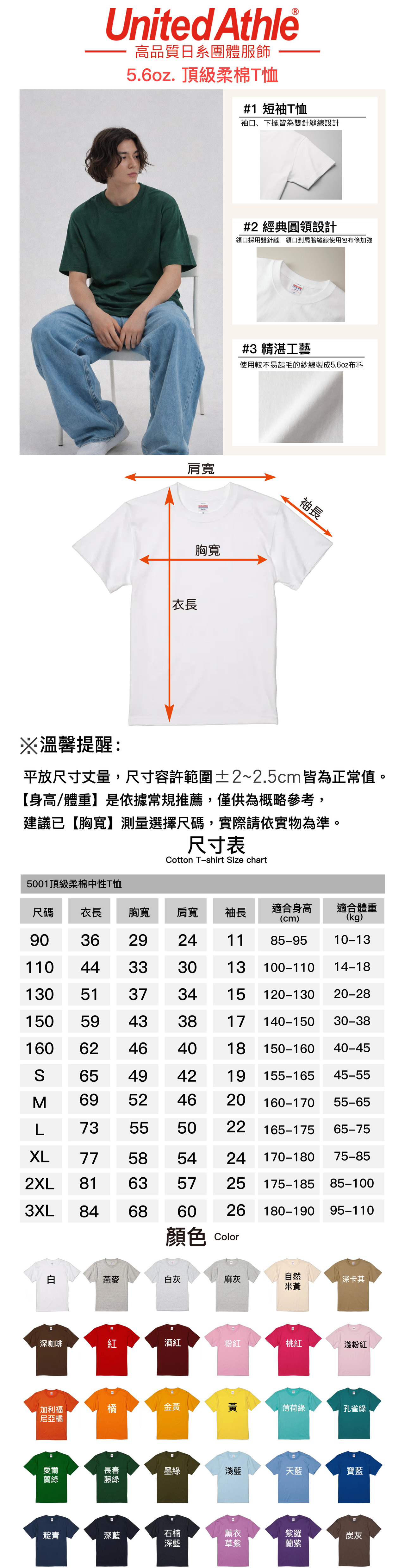 來自日本品牌 United Athle 的經典 5.6oz 高品質基本款素面 T